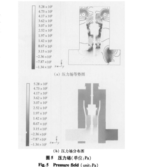 通過改變(biàn)流量系數來改(gai)變流量值,進而(ér)調整入口💜及出(chu)口條件來使浮(fu)子組件達到受(shòu)力平衡.經典的(de)👨❤️👨流量系數♊在0.9~1.0之(zhī)間,選取包括邊(biān)界值在内的5個(gè)流量系數來進(jìn)行數值仿真,得(dé)到5組仿真數✔️據(ju).在下面的分析(xī)中給出第5組數(shù)據,亦即當浮子(zǐ)受力達到平衡(heng)時的壓力場和(hé)速度場分布情(qing)況(見圖☂️5和圖6)..