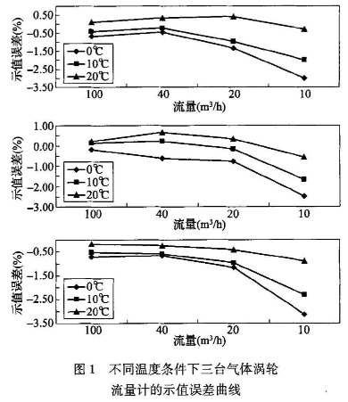 爲此選取此(cǐ)批流量計中(zhōng)3台較好的氣(qì)體渦輪流量(liang)計進行環境(jing)影響性試驗(yan),試驗條件一(yī):在20℃情況下充(chong)分恒溫,用鍾(zhong)罩式氣體流(liú)量标準裝置(zhi)檢測;試驗條(tiáo)件二:用高低(dī)溫🏃♂️試驗箱💛恒(heng)溫至與音速(sù)噴嘴實驗室(shi)🔴溫度相同的(de)溫度下,約10.5℃,用(yòng)音速噴嘴式(shi)氣體流量标(biao)🈚準裝置檢測(ce)㊙️;試驗條件三(san):用高低溫試(shì)🔴驗箱恒溫至(zhì)0℃,控制音速噴(pen)嘴實驗室溫(wēn)度到0℃或略低(di)于0℃,用音速噴(pēn)嘴式氣體👅流(liu)量标準裝置(zhì)檢測。不同🐇溫(wen)度條件下三(sān)台🔞氣體渦輪(lun)流量計的示(shì)值誤差曲線(xiàn)如🌍圖1所示。