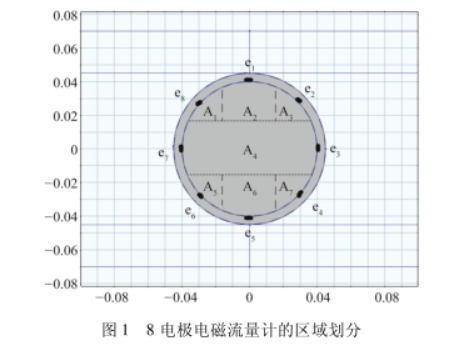 針對8電極(ji)電磁流量計采(cǎi)用了一種平行(hang)布置區域的方(fang)式,在8對電極的(de)情況下劃分出(chu)3個區域,每個區(qū)域内相對應的(de)電極處于該區(qu)域的中心位置(zhì)。然而,這種劃分(fen)方法隻能得💘出(chu)同一水平高度(du)的平均流速,無(wú)法在垂直于洛(luo)倫茲力的♋方向(xiàng)進行♊更精細的(de)劃分,分辨率🔆較(jiào)低。因此一種分(fèn)辨率更高的劃(huà)分方⛱️法。将8個電(dian)極間隔45°安裝在(zài)被測截面内壁(bì)上,電極分布如(rú)圖1所示,e1~e8依次表(biǎo)示8個電極。以電(diàn)極爲界限,進行(hang)豎直方向的劃(hua)分,相應地會得(dé)到7個感應電勢(shi)差,對應有7個求(qiú)解區域’。如圖1所(suǒ)示,從上往下将(jiang)測量區域依次(ci)分成A1~A7。其中面積(jī)比較大的A.區域(yù)是被測對象橫(héng)❤️截面積最大的(de)區域,也是産生(sheng)電勢差最大的(de)區域,其他區域(yù)的面積相對來(lái)說比較小,隻是(shì)A4區域面積的1/10左(zuo)右。這樣可以在(zài)細化劃分區域(yù)的同時,保證時(shí)間複雜度不會(huì)🔴過高,充分利用(yong)圓簡管道的特(tè)點。這種劃分方(fāng)式可以讓管道(dào)内壁🐕的電極最(zuì)大程度地讀取(qǔ)電勢值⭕,通過區(qū)域權函數理論(lun)可以更詳細地(di)反映流場内的(de)速度信息,提高(gao)🌈仿真的精度。