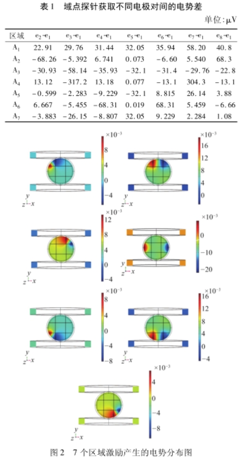 爲了獲取(qǔ)橫截面電極上(shang)的仿真電勢值(zhí),可在模型開發(fā)器🌈中選擇域點(diǎn)探針,并更新結(jie)果,即可在工作(zuò)區探針表得到(dao)㊙️感應電勢㊙️。在8個(gè)電極中把e1作爲(wei)參考電.極,與其(qí)他7個電極構成(cheng)了7對電極組合(hé),可以得到♻️7x7共49個(ge)電壓測量值,如(ru)表1所示。