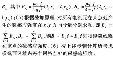 根據式(shì)(3)對電磁流量(liang)計勵磁線圈(quān)所産生感應(yīng)磁場分布情(qing)況進🙇♀️行數值(zhi)計算與仿真(zhēn)。以2個勵磁線(xian)圈幾何中心(xīn)連線爲x軸,2個(gè)電極所在直(zhí)線爲y軸,測量(liàng)管中心軸線(xian)💞爲z軸,建立空(kōng)間直角坐标(biāo)系。在該坐标(biāo)系下,計算勵(lì)磁線圈在測(cè)量管道内電(diàn)極橫截面上(shang)産生的感應(ying)磁場😘,其步驟(zhou)如下:(1)在x-y平面(mian)上測量管道(dao)的電極橫截(jie)面内,對🈲2個線(xiàn)圈之間區域(yù)進行網格化(huà),并确定每--網(wang)格⛹🏻♀️點對應的(de)坐标值(x,y,0),網格(ge)劃♍分越細,區(qu)域内磁感應(yīng)強度計算精(jing)🈲度越高;(2)把載(zai)流導線劃分(fèn)成微‼️電流元(yuan)的集合,并确(que)定每一微電(dian)流元矢量dl的(de)坐标(lx,ly,lz);(3)計算從(cong)每個網格點(diǎn)到電流元的(de)徑矢r(rx,ry,rz)及其距(jù)離r;(4)在區域内(nèi)每個網格點(dian)處,分别計算(suàn)第t個電流元(yuan)産生🥰的磁場(chǎng)強度矢量在(zài)x、y方向上的分(fèn)量Bxt和