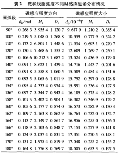 由(yóu)表2可知,當鞍(ān)狀線圈圓弧(hú)段的弧度爲(wèi)154°時,D2達到最小(xiǎo)✉️值,D、取值0.9744,同時(shí)感應磁場方(fāng)向指标θ。爲0.0954,與(yu)最小值0.0911相差(chà)不大,綜合考(kǎo)🥵慮選鞍狀線(xiàn)圈圓弧段的(de)弧度爲154°。