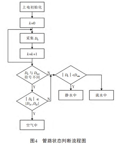 圖3所示(shì)的流程爲測(ce)量系統采樣(yang)數據的處理(li)過程🐪,因此未(wèi)涉及勵磁、通(tong)信等功能模(mo)塊。系統對采(cǎi)集的原始數(shu)據進行判斷(duan),區分🌈電極處(chu)于空氣、靜水(shui)或流水等三(sān)種不同🏃狀态(tai),如圖4所示🔞。