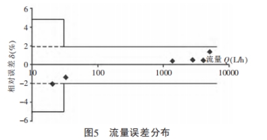 經過上述測(ce)量方法與數(shù)據處理後的(de)DN20管徑試驗樣(yàng)機測量結果(guǒ)如表1所示。從(cóng)表中可以看(kan)出,在常用流(liu)量Q3(4000L/h)内,流量傳(chuán)感器具有很(hen)好的流量特(tè)性,在R200範圍内(nei)相對誤差≤2%,在(zài)R160範圍内相對(duì)誤差≤1%。其流量(liàng)誤差分布如(ru)圖5所示,在全(quán)流量範圍内(nei),測量誤差全(quán)部在MPE(最大允(yun)許誤差)内。