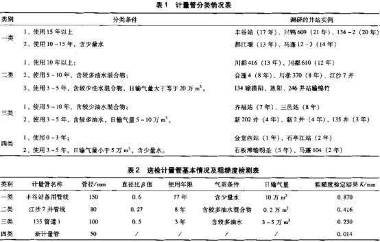 按表(biao)1分類,分(fèn)别選取(qǔ)了豐谷(gu)站備用(yòng)管線、江(jiāng)沙7井管(guǎn)線、135管道(dào)1、新計量(liang)管四根(gēn)計量管(guǎn)進行粗(cu)糙度檢(jiǎn)測,這四(sì)條⭕計量(liang)管基本(ben)情況以(yi)♉及粗糙(cāo)度檢測(ce)結果如(ru)表2。