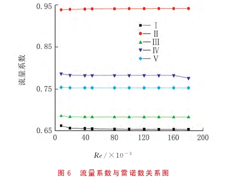 由圖(tu)6可知,雷諾數的變(biàn)化對流量系數影(yǐng)響不大,說明這幾(ji)🌈種孔闆都具有良(liang)好的穩定性。外凹(āo)型孔闆II的流量系(xi)數比其他4種大,标(biao)準孔闆I小;加厚型(xing)孔闆IV的流量系數(shu)曲線在較大及較(jiao)💯小雷諾數時變化(huà)明顯,因此該類型(xing)穩定🌐性稍差;直邊(biān)型孔闆🈲V穩定性好(hǎo)🧑🏾🤝🧑🏼。