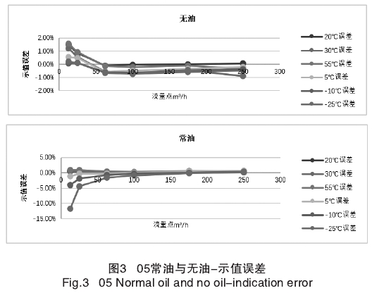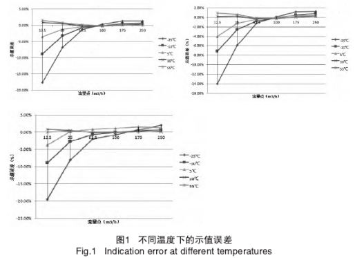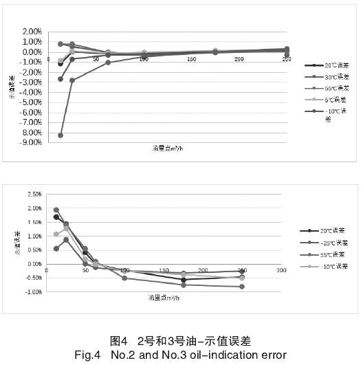 1) 清洗軸承使其(qí)沒有油脂,再添(tiān)加2号潤滑油,在(zai)常溫下運行2h,保(bǎo)證加油後的軸(zhóu)承性能滿足要(yào)求,試驗該流量(liàng)計在-25℃、-10℃、+5℃、+20℃、+30℃、+55℃下的計量(liàng)示值誤差及重(zhòng)複性,結果如圖(tú)4。