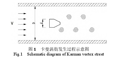 渦街流(liu)量計是基(jī)于卡曼渦(wō)街原理進(jin)行測量,在(zai)均勻流體(ti)中,垂直設(she)置阻流體(tǐ),在一定流(liu)速範圍内(nei),從阻流體(ti)兩側交替(ti)地釋放方(fang)向相反的(de)旋渦,這種(zhǒng)不對稱漩(xuan)渦稱爲卡(kǎ)曼渦街向(xiang),如圖1所示(shì)。
