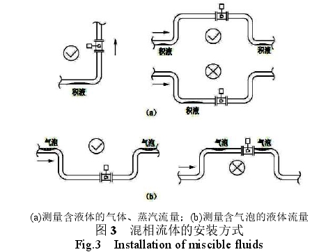 渦(wō)街流量計(ji)在管道上(shang)可以水平(ping)、垂直或傾(qīng)斜安裝,但(dan)測量混相(xiang)流體時,測(ce)量精度得(dé)不到保障(zhàng),需保證測(ce)量流體充(chōng)滿管道,避(bì)免産生混(hun)相流,根據(jù)混相流體(ti)的特點,選(xuǎn)擇合适的(de)安裝方式(shi),具體的安(ān)裝方式如(rú)圖3所示。