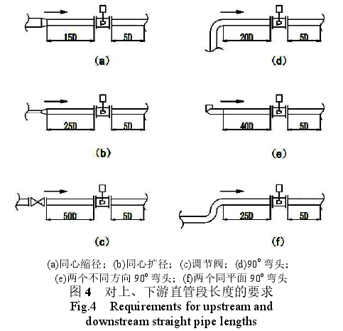 渦(wō)街流量計(ji)必須在穩(wěn)定的流束(shu)場内,有一(yī).定的直管(guan)段要求,直(zhí)管的長度(du)會影響精(jīng)度,必須保(bǎo)證上、下遊(you)直管段有(you)一定的長(zhǎng)度,通常是(shì).上遊直管(guǎn)段>10D,下遊直(zhí)管段> 5D,還要(yao)結合現場(chang)安裝情況(kuang)進行調整(zhěng),如果_上遊(you)有彎頭或(huo)者閥門,直(zhi)管段相應(yīng)的需要加(jiā)長,具體的(de)安裝要求(qiu)如圖4所示(shì)。