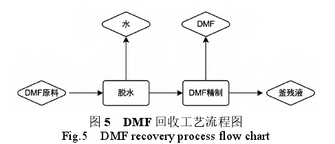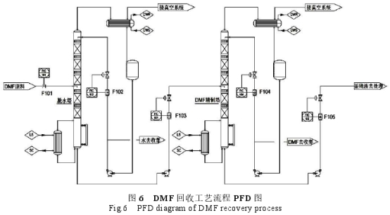 DMF回收工藝(yi)過程爲: DMF原(yuán)料進入脫(tuo)水塔,塔頂(ding)脫除.水分(fen),塔釜采出(chu)水分合格(gé)的DMF至DMF精制(zhì)塔,DMF精制塔(ta)塔頂采出(chū)合格的DMF,塔(tǎ)釜排出少(shǎo)量廢液去(qu)處理,工藝(yì)流程見圖(tu)5。