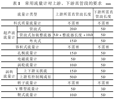 3)安裝要求原則。流(liu)量計精度,受其前(qian)後直管段長度影(yǐng)響,選型時應結合(hé)管道專業的三維(wei)模型,按照前後直(zhí)管段長度相關要(yào)求進行流量計的(de)選擇,常用流量計(ji)對.上遊、下遊直管(guan)段的要求如表1所(suǒ)示,其中D爲流量計(jì)直徑。