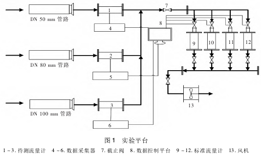 本文實驗(yan)平台是在流量(liang)計标準檢定平(píng)台基礎.上改進(jin)搭建的,增加壓(ya)差采集模塊,實(shi)現壓差與既有(yǒu)參數同步采集(jí)。實驗平台見圖(tú)1。實驗平台設置(zhì)4台标準流量計(jì),均爲羅茨流量(liàng)計,4台标準流量(liang)計的流量範圍(wéi)不同,通過不同(tong)标準流量計組(zǔ)合來提供測試(shì)所需的流量範(fàn)圍。數據采集器(qì)是溫度、壓力、流(liu)量、壓差傳感器(qi)的集合。選用數(shù)字壓差傳感器(qi),測量範圍爲-6~6kPa,精(jīng)度高于0.3%。