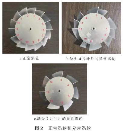 正(zheng)常流量計的渦(wō)輪葉片有14片,制(zhì)作葉片缺失4片(pian)和缺失7片的異(yi)常渦輪,置于流(liú)量計内,進行對(dui)比實驗。正常渦(wō)輪和異常渦輪(lún)見圖2。實驗過程(cheng)中渦輪拆除更(geng)換均由專業技(jì)術人員操作。