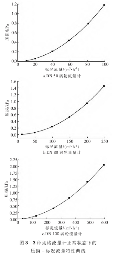 通過(guò)上述分析可以(yǐ)看出,渦輪流量(liàng)計的壓損與标(biāo)況流量成二次(cì)函數關系。當渦(wo)輪流量計異常(chang)時,壓損-标況流(liú)量特性曲線将(jiāng)偏離正常曲線(xiàn)。