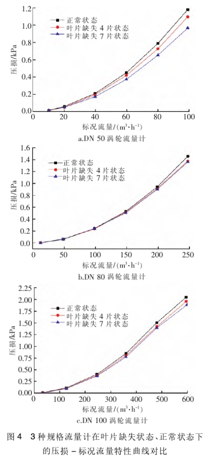 圖4爲DN50、DN80、DN100渦輪流量(liàng)計葉片缺失4片(piàn)狀态、葉片缺失(shi)7片狀态與正常(cháng)狀态的壓損-标(biao)況流量特性曲(qu)線對比。可以看(kàn)出,對每種規格(ge)的渦輪流量計(jì),在相同流量情(qíng)況下,葉片缺失(shī)狀态的壓損比(bi)正常狀态小,葉(ye)片缺失越多,壓(yā)損越小。壓損減(jiǎn)小值随着流量(liang)增大而增大,小(xiǎo)流量下的壓損(sǔn)減小值難以識(shi)别,大流量下的(de)壓損減小值也(ye)不顯著,但.當流(liú)量足夠大時,采(cai)用工業級别壓(yā)差傳感器可以(yǐ)識别。在實際運(yùn)行中,由于大流(liu)量下的壓損減(jian)小值不顯著,可(ke)能導緻較多誤(wù)判,因此需要結(jié)合流量計的高(gao)低頻脈沖數進(jin)一步判定。
