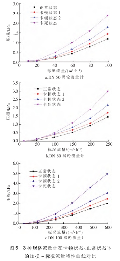 圖(tu)5爲DN50、DN80、DN100渦輪流量計(jì)卡頓狀态、正常(cháng)狀态的壓損-标(biāo)況流量特性曲(qǔ)線對比。可以看(kan)出,對每種規格(ge)的渦輪流量計(ji),當軸處于卡頓(dùn)狀态時,相對于(yú)正常狀态,相同(tong)流量下的壓損(sǔn)變大,卡頓程度(du)越大,壓損越大(dà);壓損增大值随(sui)着流量增大而(ér)增大。卡死狀态(tài)與正常狀态相(xiàng)比,壓損顯著增(zeng)大,最大流量下(xia)DN50、DN80、DN100渦輪流量計的(de)壓損分别爲正(zheng)常狀态下壓損(sǔn)的2.0、2.1、2.4倍。