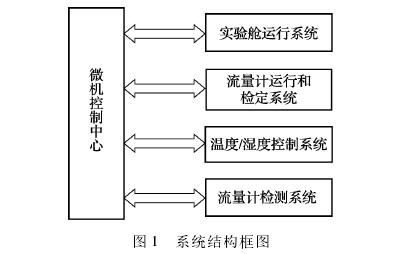 系統結構框圖(tu)如圖1所示,該系(xì)統主要由微機(jī)控制中心、實驗(yan)艙運行系統、流(liu)量計運行系統(tong)、溫度/濕度運行(háng)系統、流量計檢(jiǎn)測系統等組成(chéng)。