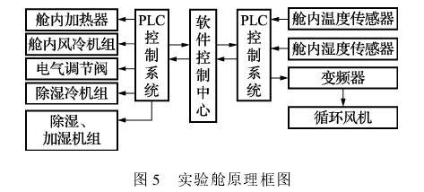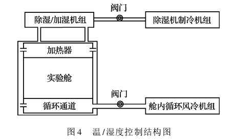 溫度和濕度控(kong)制系統用于控(kòng)制實驗艙的溫(wēn)度和濕度,主要(yào)由艙内循環風(fēng)冷機組、加熱器(qì)、除濕/加濕機組(zǔ)、除濕機制冷機(jī)組等組成,如圖(tu)4所示。