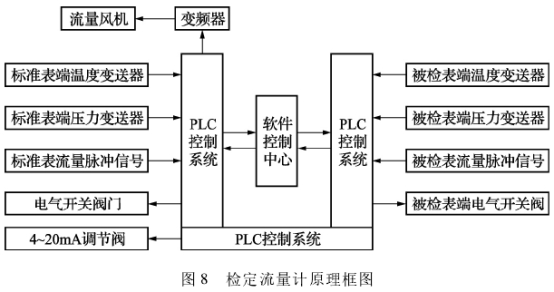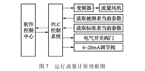 運行(háng)系統基本原理(lǐ)如圖7所示。根據(jù)流量計運行方(fāng)案由軟件控制(zhi)中心通過PLC控制(zhì)系統指令來控(kong)制閥門的打開(kai)和關閉狀态。然(ran)後軟件控制中(zhōng)心通過PLC控制系(xì)統控制電氣開(kai)關閥、4~20mA調節閥的(de)開度、變頻器的(de)頻率控制流量(liàng)風機轉速等方(fāng)式控制流量大(da)小,軟件控制中(zhong)心實時讀取标(biao)準表流量脈沖(chòng)信号并結合标(biao)準表儀表系數(shù)計算出工況流(liú)量,當工況流量(liàng)值等于目标流(liu)量值時,穩定變(bian)頻器的頻率和(hé)閥門狀态,讓各(gè)個流量計處于(yú)運行狀态中。