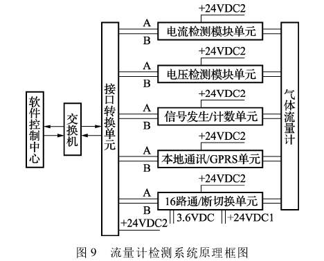 流(liu)量計檢測系統(tong)如圖9所示,用于(yu)檢測流量計運(yùn)行的各項參數(shu)是否正常,主要(yao)由軟件控制中(zhōng)心、交換機、接口(kou)轉換單元、電流(liu)檢測單元、電壓(yā)檢測單元、信号(hào)發生/計數單元(yuán)、本地通信/GPRS單元(yuan)、16路通斷切換單(dān)元等組成。
