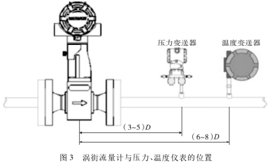 渦(wō)街流量計的(de)口徑如果與(yu)工藝管道相(xiàng)同,不能滿足(zu)流量儀🧡表要(yào)求時,或者在(zài)此流速下測(cè)量精度不能(néng)保證時,需要(yao)縮小儀表口(kou)徑,從而提高(gāo)管内流速,保(bǎo)證測量精度(du)。上下遊必須(xū)有足夠的直(zhi)管段,若傳感(gǎn)器安裝點的(de)上遊在同一(yi)平面上有2個(ge)90°彎頭時,上遊(yóu)直管段≥25D,下遊(yóu)直管段≥5D。根據(jù)測量的需要(yào),需在渦街🏃🏻流(liu)量計附近測(ce)量壓力和溫(wen)度🐉時,測壓點(diǎn)應在傳感器(qi)下遊的(3~5)D處,測(cè)溫點應在傳(chuan)感器下遊的(de)(6~8)D處,如圖3所示(shi)📐。