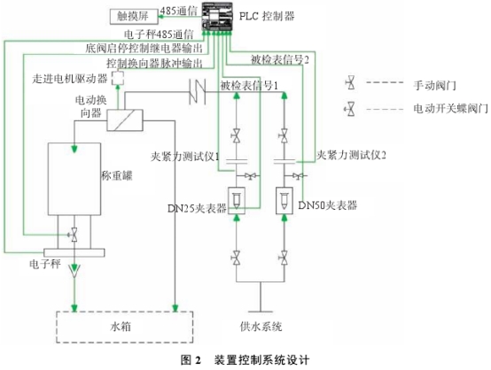 裝置控(kong)制部分(fen)主要包(bāo)括夾緊(jǐn)力控制(zhi)系統、換(huan)向器控(kong)制系統(tǒng)♍和稱重(zhong)控制系(xi)統(圖2),獲(huo)取電子(zi)稱讀數(shu)、控制夾(jia)表器、控(kòng)制換向(xiang)器動作(zuo)、控制底(dǐ)閥開關(guan)、脈沖計(ji)數等由(you)計算機(jī)完成。在(zài)夾緊力(li)控制系(xi)統的設(she)計,上,考(kǎo)慮到被(bèi)檢浮子(zǐ)流量計(jì)容易損(sun)壞,在每(mei)個夾表(biao)器.上安(an)裝夾緊(jǐn)力傳感(gan)器(夾緊(jǐn)力測試(shì)儀1和夾(jia)緊力測(ce)試儀2)。當(dang)夾緊力(lì)過大時(shí),由計算(suan)機進行(hang)夾緊力(lì)超限報(bao)警,提示(shi)操作人(ren)員停止(zhi)夾緊動(dong)作;換向(xiàng)器控制(zhi)系統中(zhōng),換向器(qì)是液體(ti)流量裝(zhuāng)置的重(zhong)要組成(chéng)部分,其(qí)不确定(dìng)度大小(xiao)對裝置(zhi)📱整體合(he)☔成不确(què)定度有(yǒu)較大影(ying)響1011)影響(xiǎng)換向器(qì)精度的(de)👉主要因(yīn)素是實(shí)際注水(shuǐ)時間和(he)觸發光(guang)電信号(hào)所産生(shēng)時間之(zhī)間的誤(wu)差凹本(ben)裝置🍓采(cǎi)用步進(jin)電機驅(qū)動分水(shui)器🐇換向(xiang),由PLC發送(song)脈沖控(kòng)制電機(jī)✉️轉速、加(jia)速度和(hé)轉動角(jiǎo)度。通✍️過(guo)PLC的高速(su)脈㊙️沖輸(shu)出通道(dao),向👨❤️👨換向(xiang)器的步(bu)進電機(ji)驅動器(qi)按照勻(yún)加速-定(dìng)速勻減(jiǎn)速的🈲方(fang)式發送(sòng)脈沖,換(huàn)向器電(diàn)機帶🌂着(zhe)換向器(qi)導流體(tǐ)進行加(jia)⛹🏻♀️速-勻速(su)-減速的(de)運行。控(kong)制換向(xiang)器運動(dòng)😄,保證裝(zhuāng)置不确(que)定度水(shui)平;稱重(zhong)⚽控制系(xì)⭕統中,裝(zhuāng)置主标(biāo)準器精(jīng)度高電(diàn)子秤🚩通(tong)過485通信(xìn)模式,将(jiāng)傳感器(qi)讀數傳(chuan)輸至PLC控(kong)制器,實(shi)現實時(shí)數據采(cǎi)集。