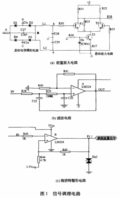 環行電(diàn)路輸出的信号(hào)低于毫伏級,需(xu)要對采集到的(de)信号🐆進行放大(da)處理。可以通過(guo)恒流源式雙人(ren)單出差🏃動放大(dà)電路,該電路能(néng)抑制零點漂移(yi),電路如圖1(a)所示(shì);傳感器得到的(de)信号夾雜着噪(zào)聲信号,爲消🚶除(chú)噪聲的👈幹擾,設(she)計濾波電路,該(gāi)電路采用無限(xian)增益多路反饋(kuì)🐇二階濾波電路(lù),該電路過渡帶(dài)窄,能改☀️善渦街(jiē)信号的頻率特(te)性,濾波電路如(ru)圖1(b)所示;信号放(fàng)大濾波電路後(hòu),爲便于單片機(jī)計數,需要對信(xin)号進行整形處(chù)理。整形電路通(tōng)過施密特觸發(fa)器電路産生方(fāng)波信号,電路如(rú)🆚圖1(c)所示;通過設(she)置可調電位✨器(qi)R8的阻值,設定門(mén)限電壓,将輸人(ren)信号轉換成脈(mo)沖信号輸人單(dān)🤩片機的P1.1端口🌈。利(li)用P1.1端口可以設(shè)置爲捕🌈獲方式(shi)獲取流量信号(hào)頻率。