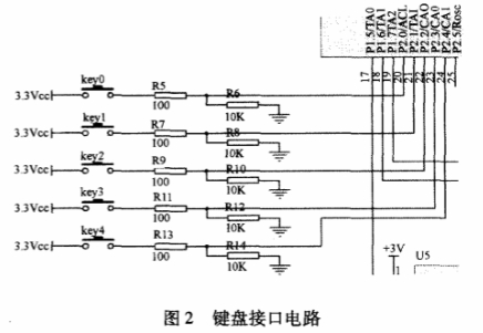 現場測量儀(yí)表在使用時,需(xū)要根據不同管(guǎn)道直徑、流體介(jiè)質、溫💋度、氣壓、黏(nian)滞系數等改變(biàn)或修正相關參(cān)數,來計算體積(ji)流🈚量或質量流(liú)量,所以儀表必(bì)須有可以現場(chǎng)修正的鍵⛱️盤。設(she)計✂️采用獨立式(shi)鍵盤來修改相(xiang)關參數值,鍵☁️盤(pan)電路主要利用(yong)MSP430單片機的I0端口(kou)來進行設計。它(ta)的6組端🚶口的每(mei)組8個IV0管腳可以(yǐ)單獨設置成輸(shu)💛人或者輸出,且(qie)每個都可獨立(lì)讀寫。如🈲圖2所示(shì)爲鍵盤接口電(dian)路,,利用P2端口的(de)每個管腳還⭐可(kě)以單獨設置爲(wei)中斷或隻讀口(kou)分别🆚與P2.0~P2.4依次連(lian)接🔞。按鍵功能分(fèn)别是返回鍵、右(you)移鍵、增1鍵、左移(yí)鍵、修改🧑🏾‍🤝‍🧑🏼鍵。當修(xiū)改鍵有按鍵動(dòng)作時觸發鍵盤(pán)中斷,其它鍵按(an)下不響應中斷(duàn)。當進人中斷後(hou)按下其它任意(yi)鍵使得🧑🏾‍🤝‍🧑🏼對應,P2口(kǒu)由100Q和1kn兩個電阻(zǔ)對3.3V分壓爲高電(dian)平3V,彈起鍵時對(duì)應P2口爲低電平(píng)0,以此作爲鍵盤(pan)掃描判斷。