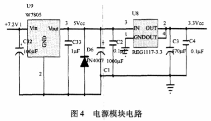 MSP430系列單(dān)片機的工作電(dian)源--般是1.8V~3.6V,并且功(gong)耗極低,電池電(diàn)壓通過W7805轉換成(chéng)+5V電源。如圖4所示(shì),該芯片輸人5V,輸(shū)出電壓爲3.3V,電流(liú)爲💛800mA,完全能滿足(zu)大多數低功耗(hào)應用場🎯合的要(yào)求,也能滿足本(ben)系統的功耗要(yào)求。