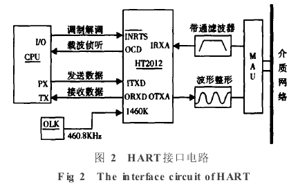 HT2012芯片用(yòng)來實現HART協議(yi)中通訊信号(hao)的解調及調(diao)制過程.圖2爲(wèi)㊙️調💔制解調器(qì)與微處理器(qì)的連接.