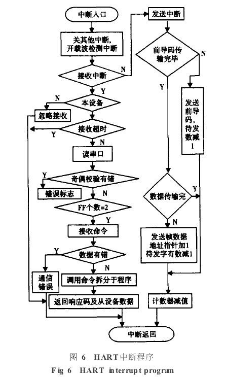 在HART通信(xin)中,智能電磁(cí)流量計作爲(wèi)從設備.進行(hang)通訊,所以這(zhè)裏👄的軟件設(shè)計隻是針對(dui)于從設備.HART通(tong)信采用水平(ping)和垂直校驗(yan)的方法.當檢(jiǎn)測到接收數(shu)據有差錯時(shí),則等到主設(she)備命令幀❄️發(fā)完後,通知主(zhu)設備數據接(jiē)收有誤.主設(shè)備則重新發(fā)命令幀,從而(ér)保證⚽通信的(de)正确可靠.HART中(zhōng)斷子程序流(liu)程圖如圖6所(suǒ)示.