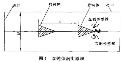 雙鈍體(tǐ)渦街流量計(ji)的基本設計(ji)思路是利用(yong)前鈍體和後(hou)鈍體引發的(de)旋渦脫離現(xiàn)象,通過試驗(yan)獲得♈使旋渦(wo)在🐪後鈍🐅體周(zhou)圍實現同相(xiàng)位疊加的最(zui)佳鈍體組合(hé),使流體❓振動(dong)得到加強,降(jiàng)低計量的下(xià)限,同時利用(yòng)鈍體兩側的(de)流體振動具(ju)有180°相位差的(de)特點,用差動(dong)式傳感器抑(yì)制共模幹擾(rao)信号的方法(fa),提高流量計(ji)的抗幹擾性(xing)能,圖1所示爲(wèi)雙鈍體渦街(jiē)流量計的原(yuan)理。