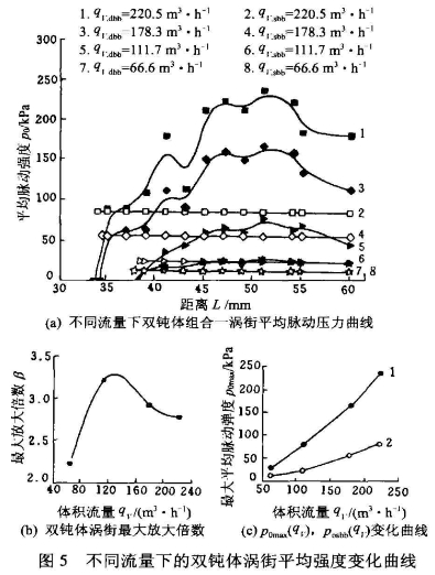 圖5b是(shì)不同流量下(xia)的渦街平均(jun1)脈動強度最(zuì)大的放大倍(bèi)數,這時定義(yì)