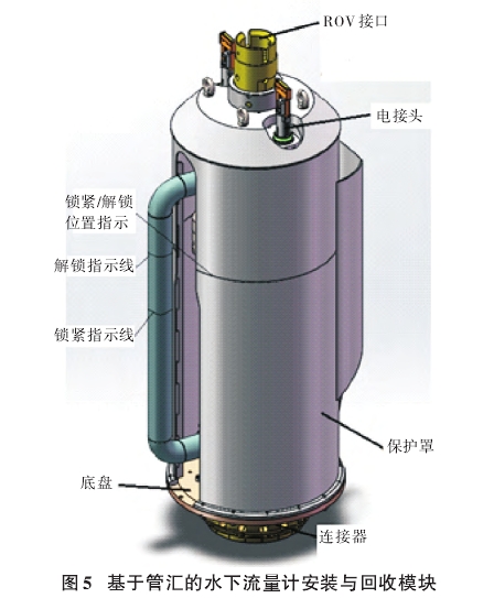 采用(yong)管彙安(an)裝的方(fāng)式需要(yao)針對流(liu)量計模(mo)塊設計(ji)對應🏃的(de)模塊👣送(sòng)入工具(jù)、導向定(dìng)位設備(bei)、軟着陸(lù)工具、過(guo)載工具(ju)以及其(qi)他配套(tao)工具來(lái)滿足流(liú)量計安(ān)裝和回(hui)收的要(yao)求。在流(liu)量👉計模(mó)塊外部(bù)設🔆計一(yī)個整體(ti)的配套(tao)安裝工(gong)具,并提(ti)供ROV操作(zuò)🔆的接口(kou)和水下(xià)的連♈接(jiē)器部分(fen),如圖5所(suo)示。送人(ren)工具可(ke)以通過(guò)ROV進行操(cao)作和控(kong)制,一般(bān)部署在(zai)修井船(chuan)和鑽探(tàn)設備:.上(shàng),含有軟(ruan)着陸系(xì)統和解(jiě)鎖、鎖緊(jǐn)裝♋置,通(tong)過操作(zuo)ROV接口,可(ke)以實現(xiàn)水下流(liú)量計底(dǐ)部✨連接(jie)器與固(gù)定安🚩裝(zhuang)在管彙(hui).上的連(lián)接接口(kǒu)的鎖緊(jǐn)和解鎖(suo)。當🈲流量(liang)計解鎖(suo)出🧑🏾🤝🧑🏼現故(gu)障時,可(ke)以通過(guò)過載工(gōng)具進行(háng)緊急解(jiě)鎖,以保(bǎo)證流量(liang)計解鎖(suo)裝置卡(ka)死的情(qing)況㊙️下,能(neng)夠實現(xiàn)緊急回(hui)收。