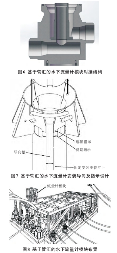同時(shí)在管彙(hui),上設計(jì)對應的(de)水下安(an)裝所需(xu)連接結(jie)構、導向(xiang)及指示(shì)設計、模(mó)塊布置(zhì)等,如圖(tu)6、圖7、圖8所(suǒ)示,通過(guo)專✌️門的(de)工具實(shi)現流量(liang)計模塊(kuài)的獨立(lì)整體安(an)裝和回(hui)收。其中(zhōng),連接結(jié)構與流(liu)量計下(xia)部的連(lián)接器相(xiàng)連,導向(xiàng)結⛷️構用(yong)于流🙇♀️量(liang)計下放(fang)🔆安裝過(guò)程中的(de)導向⭐與(yu)定位,通(tōng)過指示(shi)設計可(ke)以确認(ren)流量計(ji)定位是(shì)否正确(què),以及解(jiě)✔️鎖和鎖(suo)緊操作(zuo)是否完(wán)成。