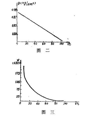 30#機油的(de)ρ(密度)一t℃(溫(wen)度)及v(運動(dong)學粘度)-t℃的(de)曲線分别(bié)見圖二、圖(tu)三。