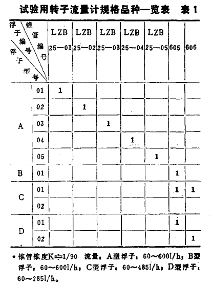 試驗(yan)用轉子流(liú)量計的規(gui)格品種見(jiàn)表1。