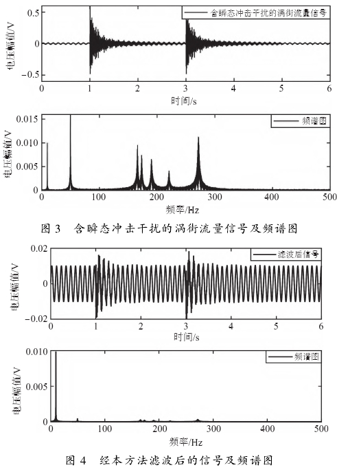 首先,驗(yàn)證本方(fāng)法對瞬(shun)态沖擊(ji)的濾波(bo)效果。渦(wō)街信号(hào)仿真模(mó)型的采(cǎi)樣頻率(lü)爲10kHz、采樣(yang)時間爲(wèi)6s,加入兩(liǎng)次瞬态(tai)振動幹(gan)擾,管道(dao)直徑分(fen)别爲25mm;和(hé)50mm,流體介(jie)質爲氣(qi)體和液(yè)體。以管(guǎn)徑爲25mm、頻(pín)率爲9.54Hz的(de)液體介(jiè)質信号(hao)爲例,含(hán)有瞬态(tai)沖擊幹(gan)擾的渦(wō)街流量(liàng)信号波(bo)形及其(qí)頻譜圖(tú)如圖3所(suo)示經過(guò)本方法(fa)處理後(hou)的波形(xíng)及頻譜(pǔ)圖如圖(tú)4所示。從(cong)圖3和圖(tu)4中可以(yi)看出,瞬(shun)态沖擊(jī)幹擾被(bèi)有效濾(lü)除了。