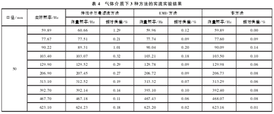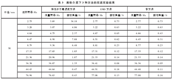實(shí)流實驗(yan)的管道(dào)口徑爲(wei)50mm,流體介(jie)質爲氣(qi)體和液(yè)體,采樣(yang)頻率爲(wei)10kHz,采樣時(shi)間爲6s。每(mei)組實驗(yan)選取10個(gè)流量點(dian),主要是(shi)受噪聲(sheng)影響較(jiào)大的低(dī)流速信(xin)号。表3和(hé)表4分别(bie)爲管徑(jing)爲50mm液體(ti)和50mm氣體(tǐ)的3種方(fang)法的處(chu)理結果(guo),其中實(shi)際頻率(lü)爲标定(dìng)裝置上(shang)标準表(biǎo)的信号(hào)頻率。