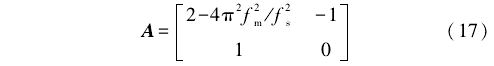 用ƒm表示(shì)狀态模(mo)型頻率(lü),用ƒmax,表示(shì)渦街信(xìn)号的最(zui)大頻率(lü),令ƒm=ƒmax。這樣(yàng)設置的(de)目的是(shi)減少叠(dié)代次數(shù)和計算(suan)量。于是(shi),式(3)中的(de)系數矩(jǔ)陣A可用(yòng)式(17)表示(shì)。