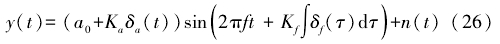 式(shi)中:α0爲渦(wo)街信号(hào)幅值;f爲(wei)渦街信(xin)号頻率(lü);Kƒ、Kα分别爲(wei)調頻靈(líng)敏度和(he)調幅靈(líng)敏度,K,爲(wei)渦街信(xin)号頻率(lü)與采樣(yang)頻率的(de)比值,設(she)Kα=1;δα(t)和δƒ(t)分别(bié)爲高斯(si)白噪聲(shēng)和渦街(jiē)信号幅(fu)度和頻(pin)率的波(bo)動偏差(chà);n(t)爲其他(tā)噪聲幹(gàn)擾,包括(kuo)低頻振(zhen)蕩幹擾(rao)、工頻幹(gàn)擾、周期(qī)振動幹(gàn)擾和随(sui)機幹擾(rao)。