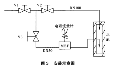 電磁流量計(jì)安裝在一根(gen)DN50mm的管道上,原(yuán)供水管爲φ108mm,将(jiāng)其🔴作爲旁通(tong)用途。正常情(qíng)況時,打開V1、V3閥(fá),關閉V2閥,補充(chong)❗水通過電磁(ci)流量計計量(liang)🍓後向蓄水池(chí)供水。當電磁(ci)流量計故障(zhàng)或者檢修時(shí),關閉V3閥,打開(kāi)V1、V2閥向蓄水池(chi)🏒供水,以保證(zheng)生産不受影(yǐng)響,還可以方(fāng)便電磁流量(liàng)‼️計的零點校(xiao)驗。安裝示意(yì)圖見圖3。