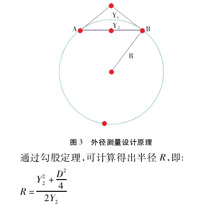 外徑測(cè)量設計原理如(rú)圖3所示,圖中R爲(wei)目标測量對象(xiàng),A、B兩點爲設備觸(chu)點,A和B的主體支(zhi)架采用固定支(zhī)架,其中AB之間的(de)距離爲固定值(zhi)D,Y1爲伸縮量尺,Y2爲(wei)縮進距離。