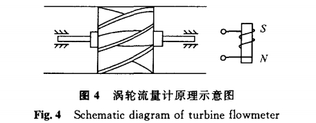 是基于(yu)動量矩(ju)守恒原(yuán)理制造(zào)的速度(dù)式流量(liàng)儀表,即(jí)利用置(zhi)于流體(ti)中葉輪(lún)的旋轉(zhuan)角速度(du)與流體(tǐ)流速成(chéng)比例的(de)關系,通(tong)過測量(liang)葉輪的(de)轉速來(lái)反映通(tong)過管道(dào)的體積(ji)流量,是(shi)目前流(liu)量儀表(biǎo)中比較(jiao)成熟的(de)高精度(du)儀表,工(gong)作原理(lǐ)如4所示(shi)。