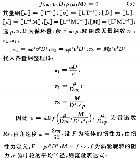 當渦輪(lun)結構一(yi)定時,渦(wo)輪流量(liang)計流速(su)v與葉輪(lun)的轉速(su)相關,故(gu)影響因(yin)素有:葉(yè)輪的旋(xuan)轉角速(su)度w、流體(tǐ)密度ρ、動(dòng)力黏度(du)系數μ、管(guan)徑D、葉輪(lun)轉動的(de)阻力矩(ju)M(包括摩(mó)擦阻力(lì)矩和磁(ci)阻尼力(li)矩等).據(ju)π定理:
