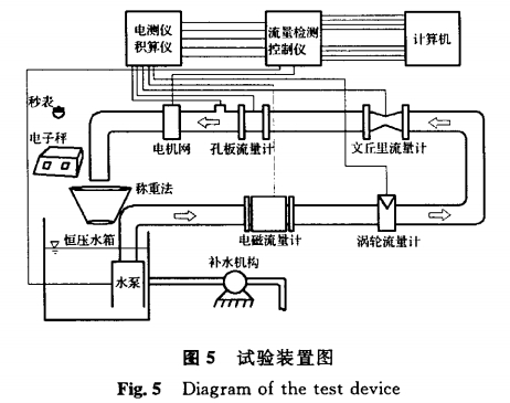 試驗(yan)測試裝(zhuāng)置由電(dian)磁、渦輪(lun)、文丘裏(lǐ)和孔闆(pan)4個同口(kǒu)徑(中25mm)的(de)流量計(ji),組成串(chuàn)聯管路(lù)、自動切(qiē)換控制(zhi)儀、計算(suan)機測控(kong)系統、自(zì)循環供(gong)水系統(tong)及輔助(zhù)補水機(ji)構,如圖(tu)5所示。