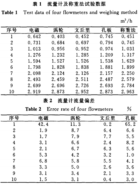采用(yòng)标準孔(kǒng)闆角接(jie)取壓,β=0.450;文(wen)丘裏流(liú)量計采(cai)用圓錐(zhui)形文丘(qiū)裏管,β=0.628;電(diàn)磁流量(liang)計傳感(gan)器型号(hào)LDG-25S,精度1級(ji);渦輪流(liu).量計傳(chuán)感器型(xing)号LWGY-25A,精度(du)0.5級。輔助(zhù)補水機(jī)構的作(zuo)用是當(dāng)用稱重(zhòng)法測量(liàng)時,對水(shuǐ)箱進行(hang)補水以(yi)保持水(shuǐ)箱水位(wei)不變,形(xing)成管道(dào)内恒速(sù)定常運(yùn)動。系統(tong)管徑φ25mm,流(liu)量範圍(wei)0~3m3/h。各流量(liàng)計數據(jù)由計算(suan)機瞬時(shi)采集。稱(cheng)重法由(yóu)秒表記(ji)錄時間(jian),電子秤(cheng)測試重(zhòng)量,采用(yòng)同一流(liú)量測3次(cì),取平均(jun1)值爲測(ce)定流量(liang)。同一流(liú)量4個流(liú)量計和(hé)稱重法(fa)同時測(ce)量,測定(dìng)流量值(zhí)各不相(xiang)同,以稱(chēng)重法爲(wei)真值基(jī)準,通過(guò)分析對(dui)比,揭示(shi)各自的(de)性能特(te)點。
