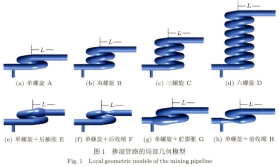 爲研究管(guǎn)路結構對摻(chān)氫天然氣摻(chān)混狀态影響(xiǎng),本文在單👌螺(luo)旋管摻混管(guǎn)路的基礎上(shàng),使用Design.modeler構建了(le)8種摻混管路(lù)的3維模型,如(ru)圖💋1所示。摻混(hun)管路分别爲(wèi)不同匝數螺(luo)旋管(單螺旋(xuán)🔆A型、雙螺旋B型(xing)、三螺旋C型、六(liu)螺旋D型)和單(dan)螺旋管路結(jie)合變徑管路(lu)(單螺旋+後膨(péng)脹💜E型、單螺旋(xuán)+後收縮F型、單(dan)螺旋+前膨脹(zhàng)G型、單螺旋+前(qián)收👌縮H型)。由于(yú)将密度較輕(qing)氫氣從🧡底部(bu)充入天然氣(qi)管路能取得(dé)🐅較好的摻混(hun)效果,因此設(shè)計從管路底(dǐ)部充入天然(ran)氣。具體參數(shù)設置爲:管路(lu)直徑✊D=100mm,甲烷入(rù)口直徑爲1D,氫(qīng)✨氣入口直徑(jing)爲0.5D,出口直徑(jìng)爲1D,螺旋管曲(qǔ)率半徑爲2D。氫(qīng)氣入口(支管(guan)軸線)距螺旋(xuán)管起始截面(miàn)長度爲3D,多匝(za)螺㊙️旋管螺距(ju)爲1.5D。膨脹管長(zhang)度爲3D,膨脹管(guǎn)直✏️徑最大處(chu)爲.1.5D;收縮管長(zhang)度✌️爲3D,收縮管(guan)直徑最小處(chu)爲0.5D。爲使氣體(tǐ)🔞充分摻混,将(jiāng)下遊管路總(zǒng)長度設置爲(wèi)150D。在計算不同(tong)匝數螺旋管(guǎn)及單螺旋管(guan)‼️路結合變徑(jìng)管路結果時(shi),定義的長度(du)L是以螺旋.管(guan)終🏒止截面爲(wèi)起👉點。