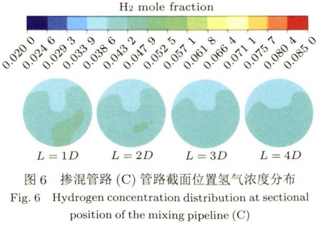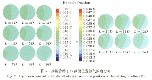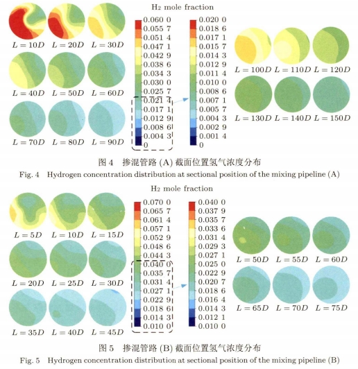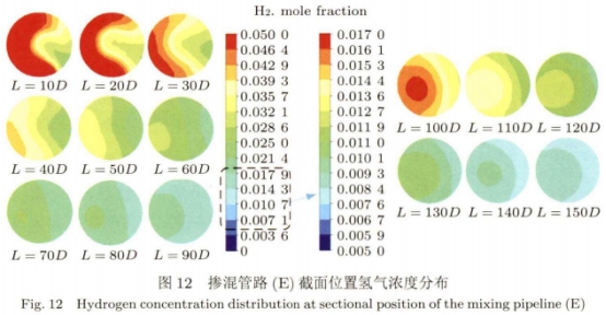 如(ru)圖4所示摻混(hùn)管路A在螺旋(xuán)管路出口處(chù)渦流作用非(fei)常劇烈,其分(fen)層現象明顯(xian)。且不同于--般(bān)氫氣的上下(xia)分層,摻混管(guǎn)路A中管道中(zhong)的氫氣直存(cún)在左右分層(ceng),直至摻混距(jù)離在140D~150D達到摻(chan)混均勻,此時(shi)氫氣摩爾🈲分(fèn)數均約爲0.8%。圖(tú)5所示摻混管(guǎn)路B的管路截(jié)📞面氫氣濃度(dù)分布變化規(gui)律與圖4相似(si),直至摻混距(ju)離在65D~70D達到摻(chān)混均勻,氫氣(qì)基本不再分(fèn)層,此時氫氣(qi)摩爾分數㊙️均(jun)約爲1.9%。而✍️圖6所(suǒ)示🐆的摻混管(guan)路C在螺旋管(guan)道出口處就(jiù)已經基本達(dá)到摻🔴混.均勻(yun),氫氣已基本(ben)不存在分層(céng),此時氫😄氣摩(mó)爾分數均約(yuē)爲3.9%。相比摻混(hun)管路C的三匝(zā)螺旋管,圖7所(suo)示摻混管路(lù)D增加到六匝(zā)螺旋的摻混(hun)效果反而下(xià)降。螺旋管道(dao)出口氫氣分(fen)層,直至摻混(hun)15D時👨❤️👨達到摻混(hùn)均勻,氫氣不(bu)再分層,此時(shi)氫氣摩爾分(fèn)數約爲💯2.0%。